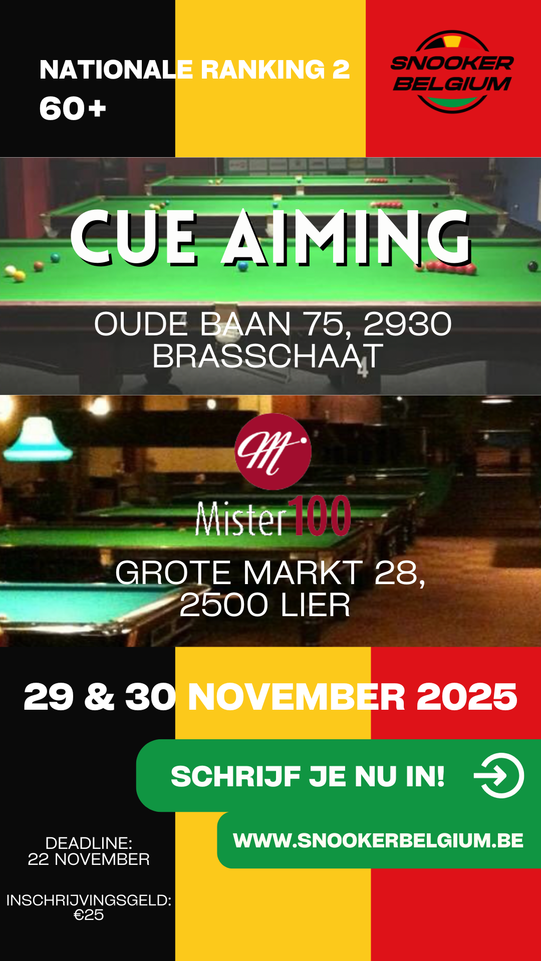 Hierbij we jullie informeren over het format voor de volgende NR Seniors 60+, die zal doorgaan in Cue Aiming Brasschaat en Mister 100 Lier.